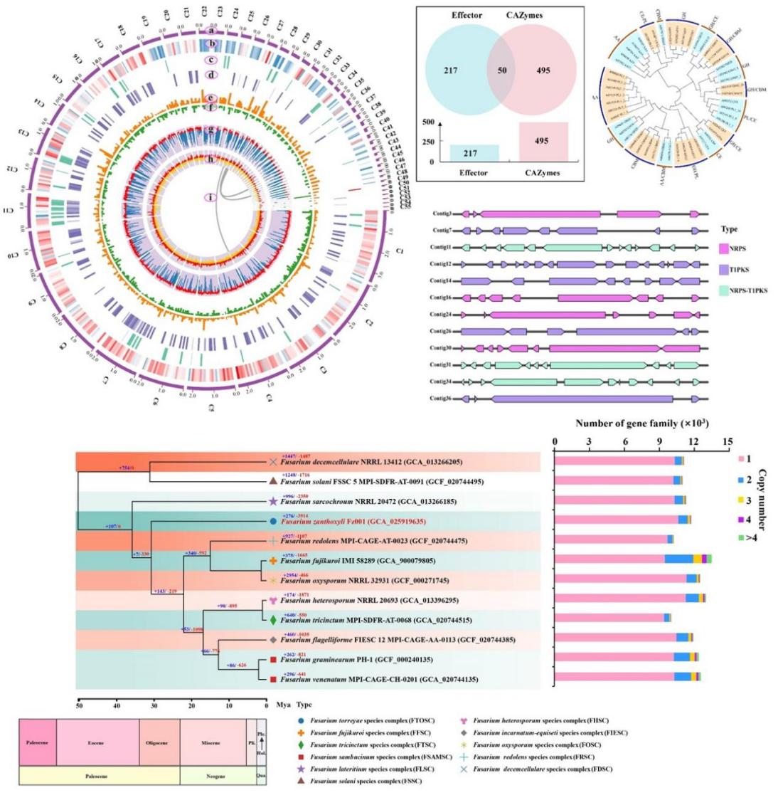 以“Genome sequencing and comparative genomics reveal insights into pathogenicity and evolution of Fusarium zanthoxyli, the causal agent of stem canker in prickly ash”为题的研究,结合基因组二代和三代测序技术,获得了花椒干腐病菌F. zanthoxyli的高质量基因组,其大小为43.39 Mb,预测到11,316个蛋白编码基因并对其功能进行了注释;基于F. zanthoxyli全基因组,预测了与F. zanthoxyli致病相关的基因,包括495 个CAZymes合成相关基因、217个效应蛋白基因、156个CYP450s基因和202个次生代谢毒素合成相关基因;通过比较基因组学,明确了Fusarium的系统进化时间,其在141.1~88.4 MYA从Colletotrichum中分化而来,且确定了F. zanthoxyli在物种进化过程中的分化时间为34.6~26.9 MYA,阐明了F. zanthoxyli与4种重要镰刀菌在进化过程中受到的选择压力,揭示了F. zanthoxyli在进化过程中的基因扩展与收缩事件,分析了F. zanthoxyli的特有基因及扩展基因的功能结构域。该研究为F. zanthoxyli分子致病机制的深入解析奠定了遗传基础,为深入研究花椒与F. zanthoxyli互作的分子机制奠定了基础。